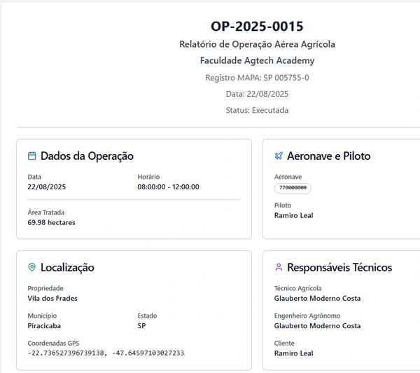 O MAPA (Ministério da Agricultura, Pecuária e Abastecimento) exige que operadores de aeronaves remotamente pilotadas (ARPs) para aplicação de agrotóxicos e afins apresentem relatórios mensais de atividades no SIPEAGRO (Sistema Integrado de Produtos e Estabelecimentos Agropecuários). Além disso, é necessário manter à disposição da fiscalização os registros das aplicações, mapas de aplicação e receituários.